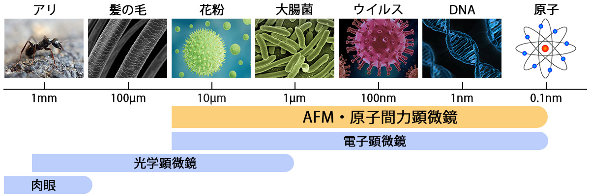原子間力顕微鏡 (Atomic Force Microscopy 以下、AFM)とは、走査型プローブ顕微鏡 (Scanning Probe Microscope 以下、SPM) の一種であり、試料表面を微細なプローブで走査し、ナノスケールの表面構造を三次元的に測定する装置です。AFMの分解能は非常に高く、プローブの深針のサイズにもよりますが、原子などのサブナノレベルまで測定することができます。